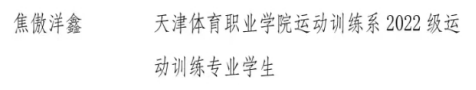 近日,在五四青年节即将到来之际👏🏼,共青团天津市委员会下发《关于表彰第23届“天津青年五四奖章(集体)”♝、2024年“天津市五四红旗团委(团支部)”、“天津市优秀共青团员”、“天津市优秀共青团干部”的决定》(津团发〔2024〕5号),其中我院运动训练系2022级学生焦傲洋鑫荣获“天津市优秀共青团员”荣誉称号🖖🏼。