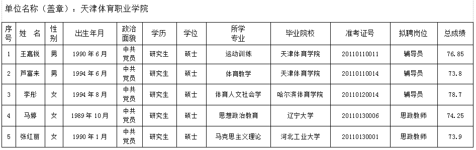 根据《天津市事业单位公开招聘人员实施办法(试行)》(津人社局发〔2011〕10号)文件精神,下列人员经笔试、面试、体检🏄🏼‍♀️、考察等程序确定为拟聘人员,现予公示。
