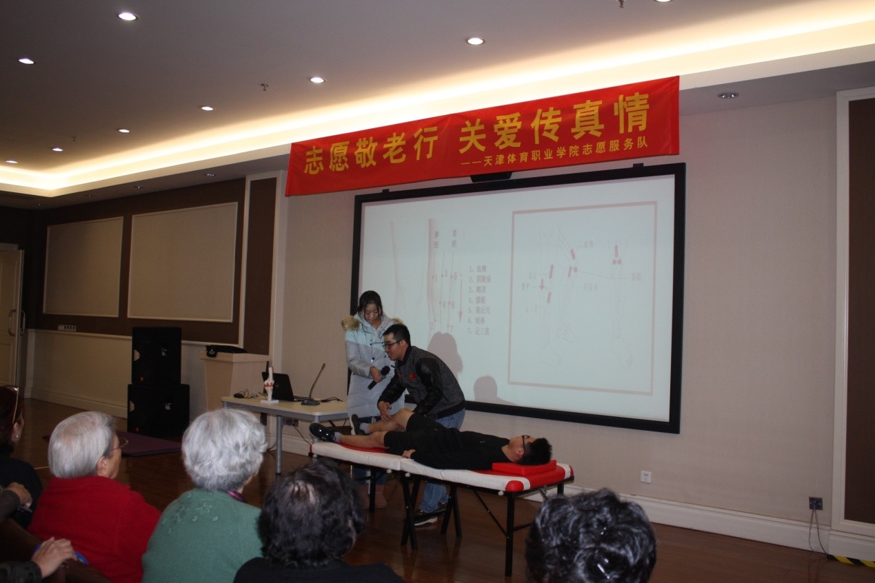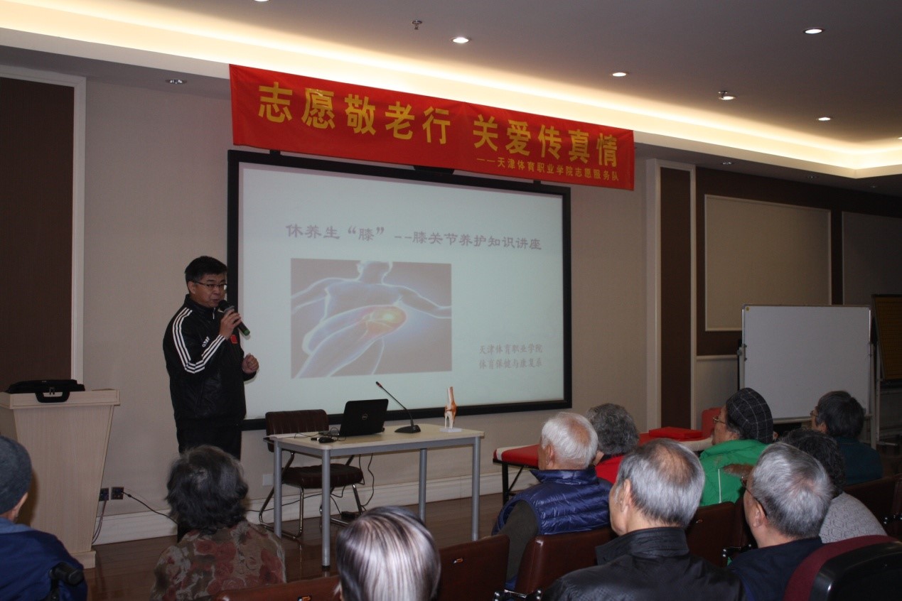 12月3日上午🤾🏿♀️,按照天津市第十一届社区教育展示周🐛,暨2017年天津市全民终身学习活动周的工作要求🎫,学院领导高度重视,亲自带队并部署工作🏊🏽,经办公室组织协调,体育保健与康复系的师生到位于静海区的康宁津园老年公寓举办《休养生“膝”——老年人膝关节养护知识》主题讲座🗼,为老年人讲解关于膝关节养护知识,带领他们实践操作并解答健康难题😭。