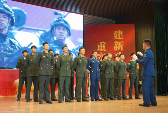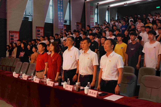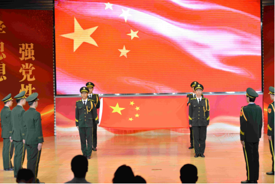 在全场的庄严注目下🗑,学院国旗护卫队出旗,全场奏唱中华人民共和国国歌。