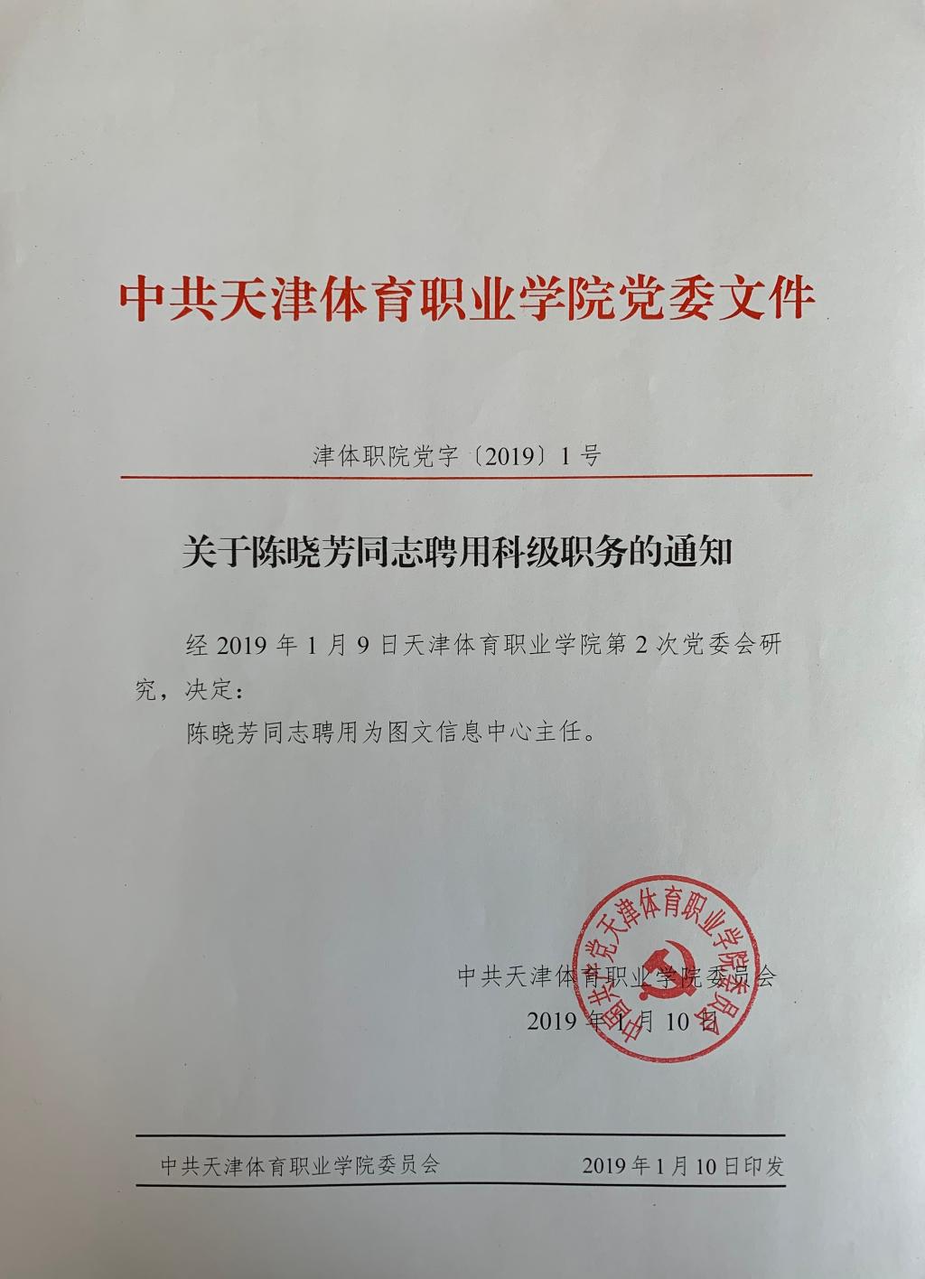 关于陈晓芳同志聘用科级职务的通知